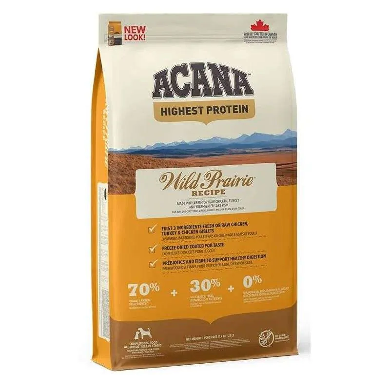 Repleto de pollo y pavo de corral, huevos de corral enteros y pescados de captura silvestre de nuestros fríos lagos del norte, y entregados frescos todos los días en proporciones de WholePrey, ACANA Wild Prairie está rebosante de calidad natural.