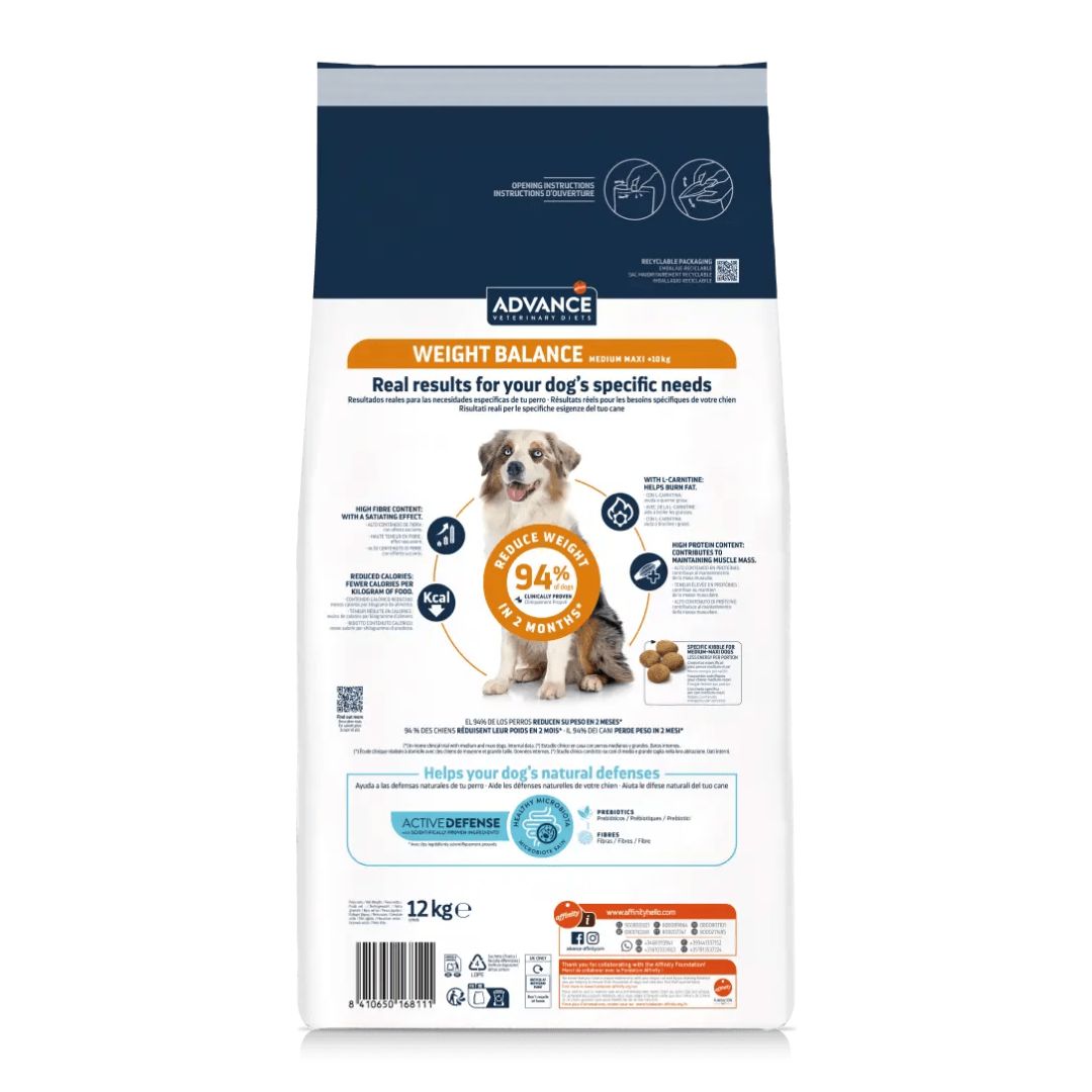 Advance Vet Diets Weight Balance Medium Maxi Canine es un alimento dietético completo para perros adultos de tamaño mediano y grande.