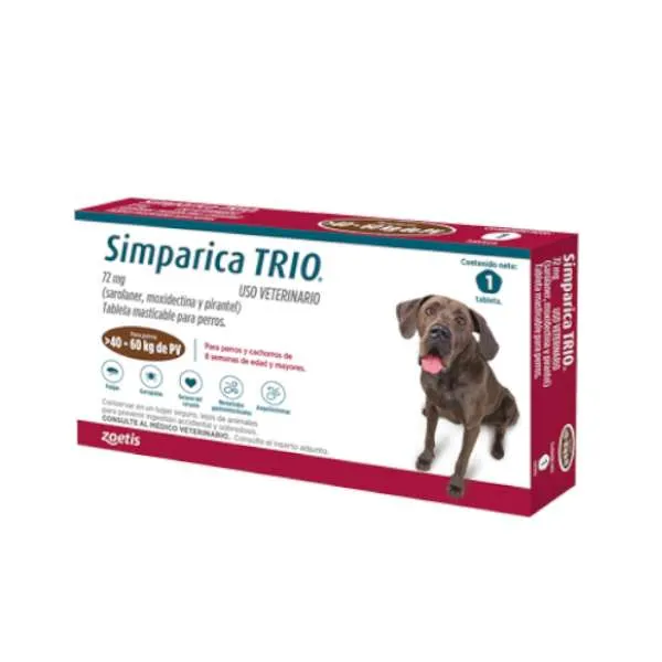 Simparica Trio es un medicamento veterinario que combina tres principios activos: sarolaner, moxidectina y pirantel. Se presenta en comprimidos masticables para la prevención y tratamiento de pulgas, garrapatas, nematodos gastrointestinales y angiostrongilosis en perros.