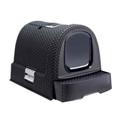Innovador arenero curver para gatos en forma de caseta que oculta malos olores. Con un diseño exclusivo y elegante, la caseta está fabricada en plástico resistente y acabada en ratán (mimbre).