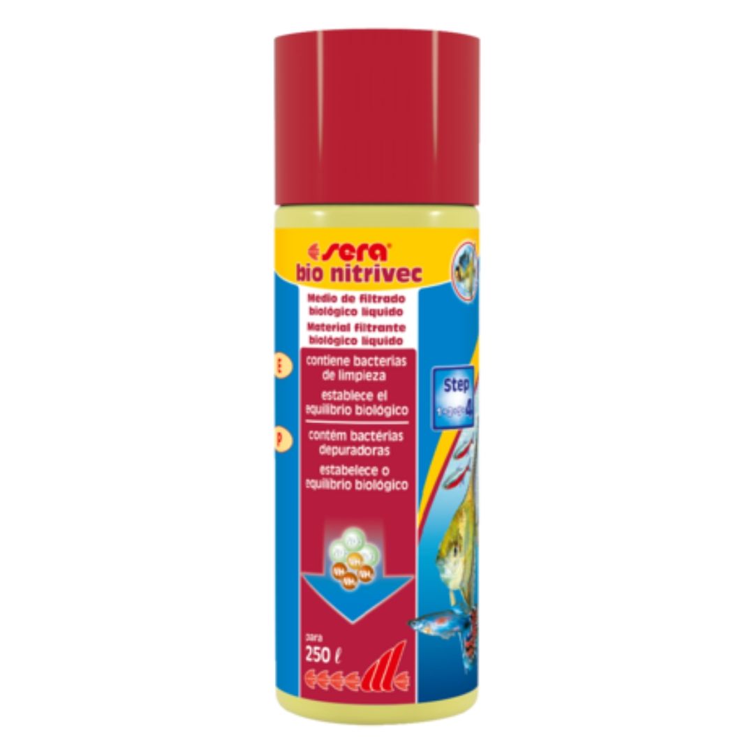 Bacterias para filtración Sera bio nitrivec, un producto de la biotecnología de Sera, contiene millones de bacterias de limpieza que permiten establecer rápidamente el equilibrio biológico, de manera que las sustancias tóxicas se descomponen continuamente.
