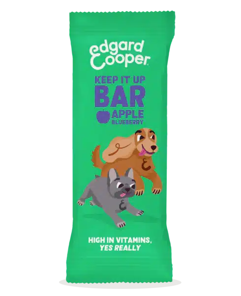 Estos snacks veganos para perros (Bar apple blueberry) están elaborados por la marca de origen belga especializada en comida para perros y gatos, Edgard & Cooper.