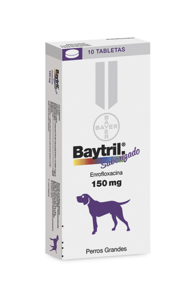 La enrofloxacina o Baytril Saborizado de 150 mg se administra por vía oral en perros y gatos. La dosis práctica es de 1 tableta por cada 30 Kg de peso del animal de 5 a 7 días. En esta presentación no se recomienda el uso en gatos, es mejor utilizar la presentación de Baytril 50 mg.