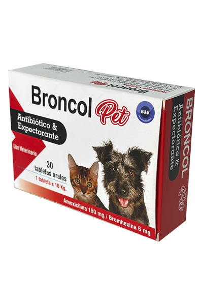 Broncol Pet es el tratamiento ideal para infecciones respiratorias en perros y gatos, combinando Amoxicilina y Bromhexina para combatir eficazmente la tos y facilitar la eliminación de mucosidad. Este medicamento es esencial para el manejo de rinitis, bronconeumonías, y tos de la perrera, ofreciendo una solución completa para el bienestar respiratorio de tu mascota.