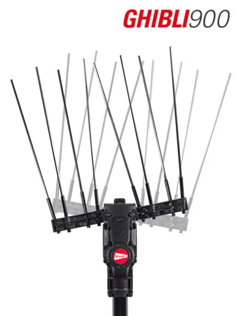 El cabezal de Vareador profesional Ghibli, de gran calidad mecánica, técnica e investigación. Una nueva cinemática de dos barras hace que acoplado a la máquina, ésta sea aún más silenciosa y optimiza la sincronización del cabezal para una recolección más enérgica y efectiva. El nuevo movimiento del peine vibratorio permite alcanzar grandes cantidades de derribos sin dañar los frutos y nuevos brotes. La máquina está equipada con una barra de carbono que reduce el peso y absorbe las vibraciones.