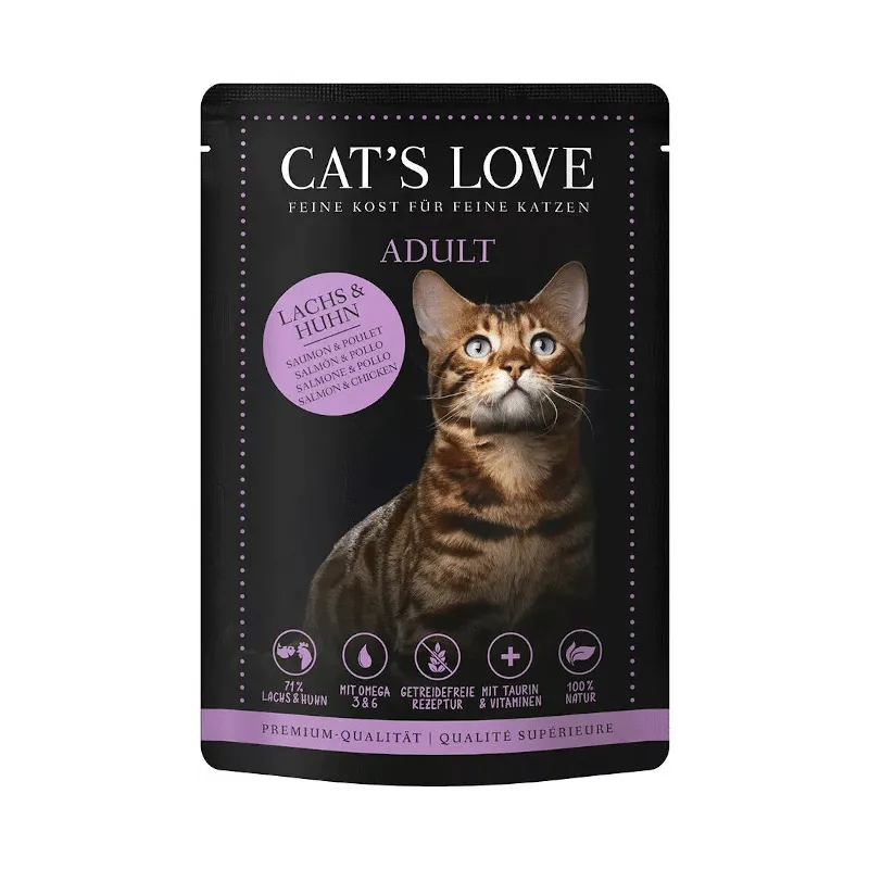Salmón y pollo 71 % (carne de pollo, salmón, corazones de pollo, hígado de pollo, estómagos de pollo, cuellos de pollo), caldo 27,7 %, minerales 1 %, aceite de salmón 0,2 %, perejil 0,1 %