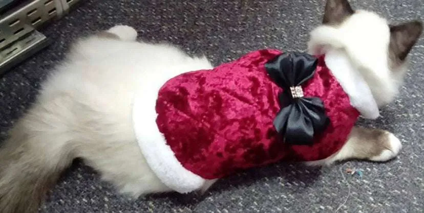 Chaleco de color rojo vino para perros y gatos con Rib ultra soft blanco y aplique de moño en cinta negra. Material suaventina de alta calidad. Abriga y a la vez saca a pasear con el mejor estilo a tu mascota. Para mayor precisión toma un metro y mide el contorno del cuello y del pecho . LAVAR A MANO, no utilizar secadora.