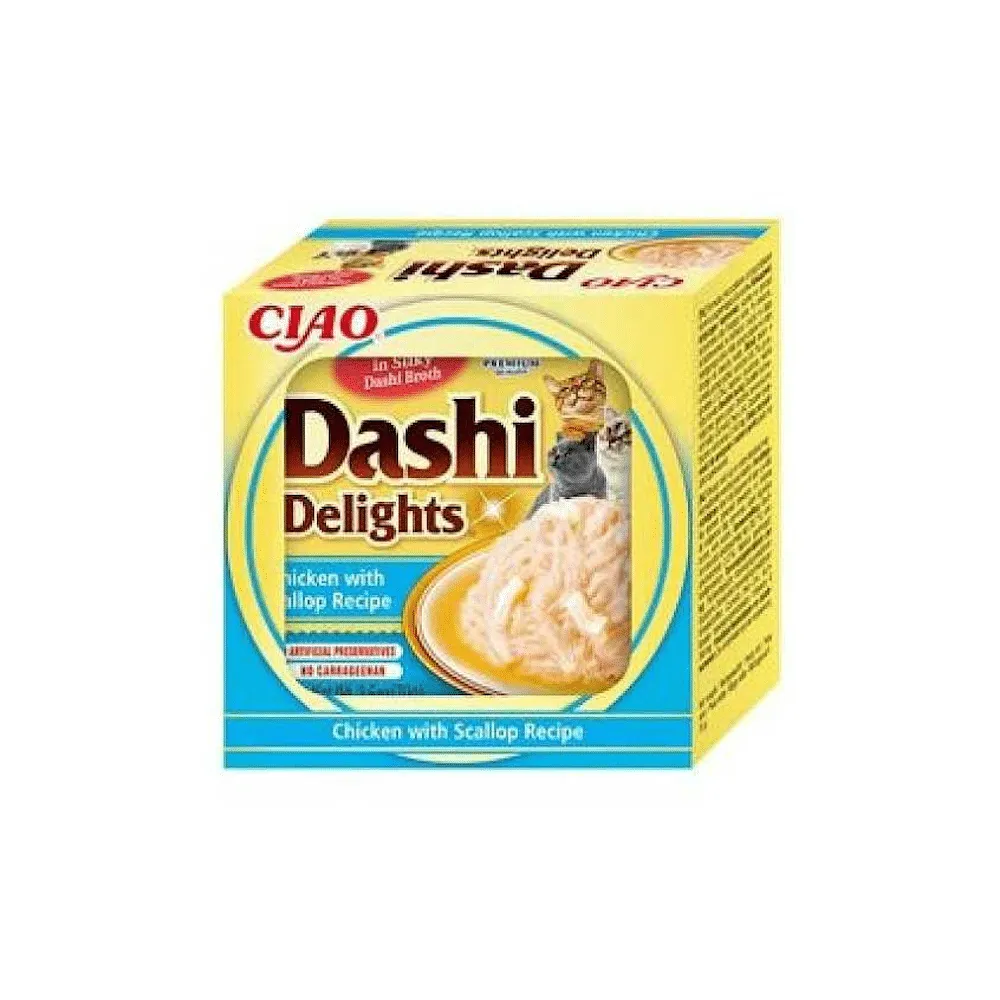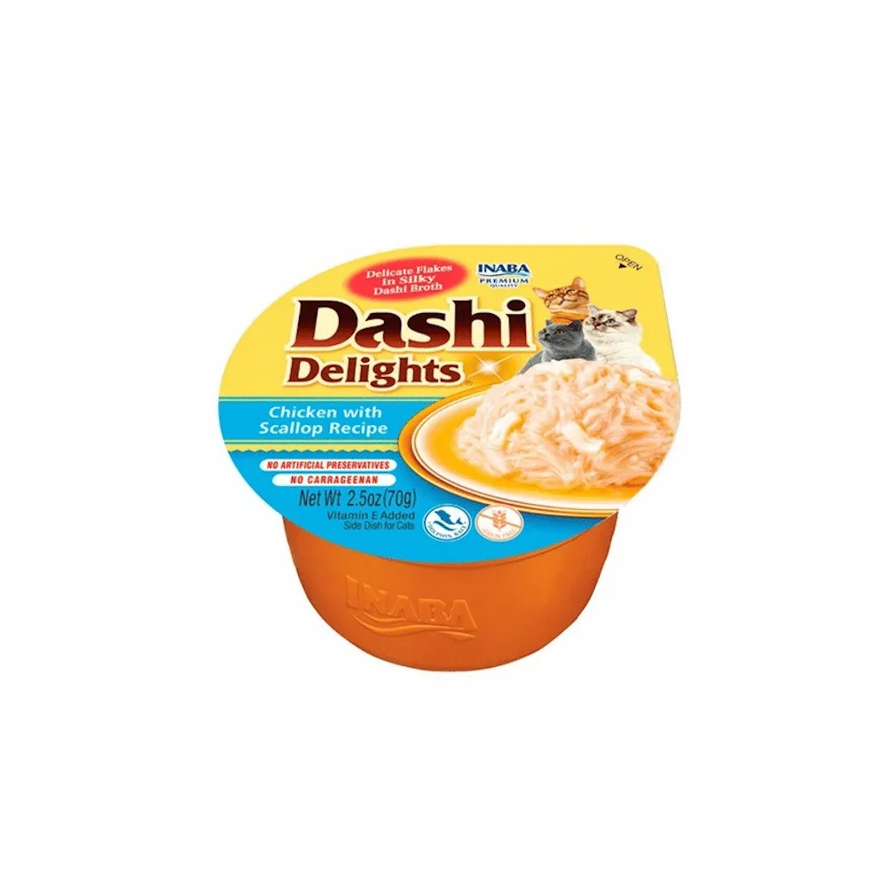 El dashi es un caldo de pescado tradicional japonés a base de hojuelas de atún listado, famoso por su rico y expresivo gusto. Es un manjar único con alta humedad, rico en proteína animal, sin cereales, aditivos indeseables e ingredientes artificiales. Dashi Delights de INABA son un alimento complementario que hará que cada comida sea deliciosamente excepcional. ¡Hidratante, nutritiva y siempre deliciosa!