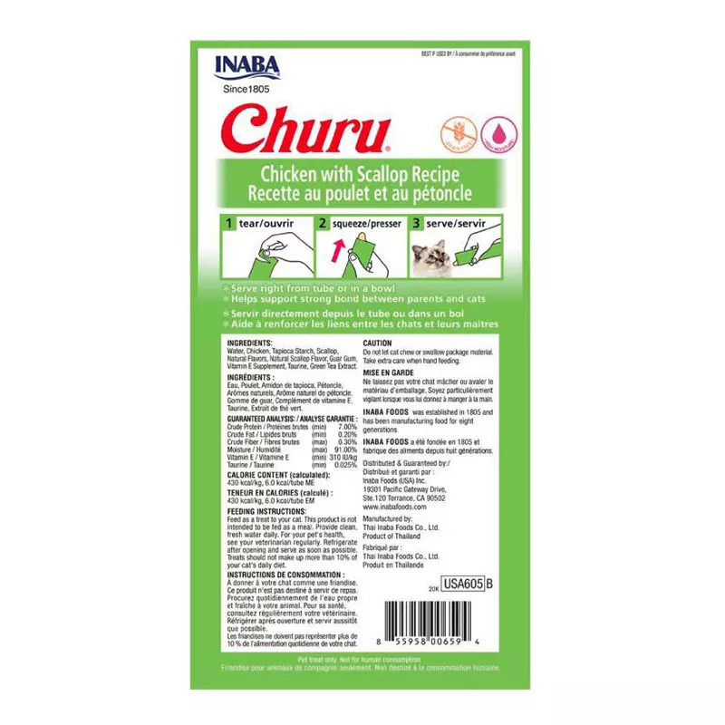 ¡Estos sabrosos snacks para gatos se hacen con atún silvestre o pollo criado en granjas puro y natural! Disponibles en nueve variedades deliciosas, los Churu® Purés tienen el alto contenido de humedad necesario para la salud de los felinos. Simplemente rasgue un tubo y apriételo un poco para alimentar a mano a su felino con estos snacks sin cereales ni conservantes. También puede verterlo en un plato o añadirlo por encima de alimentos húmedos o secos.