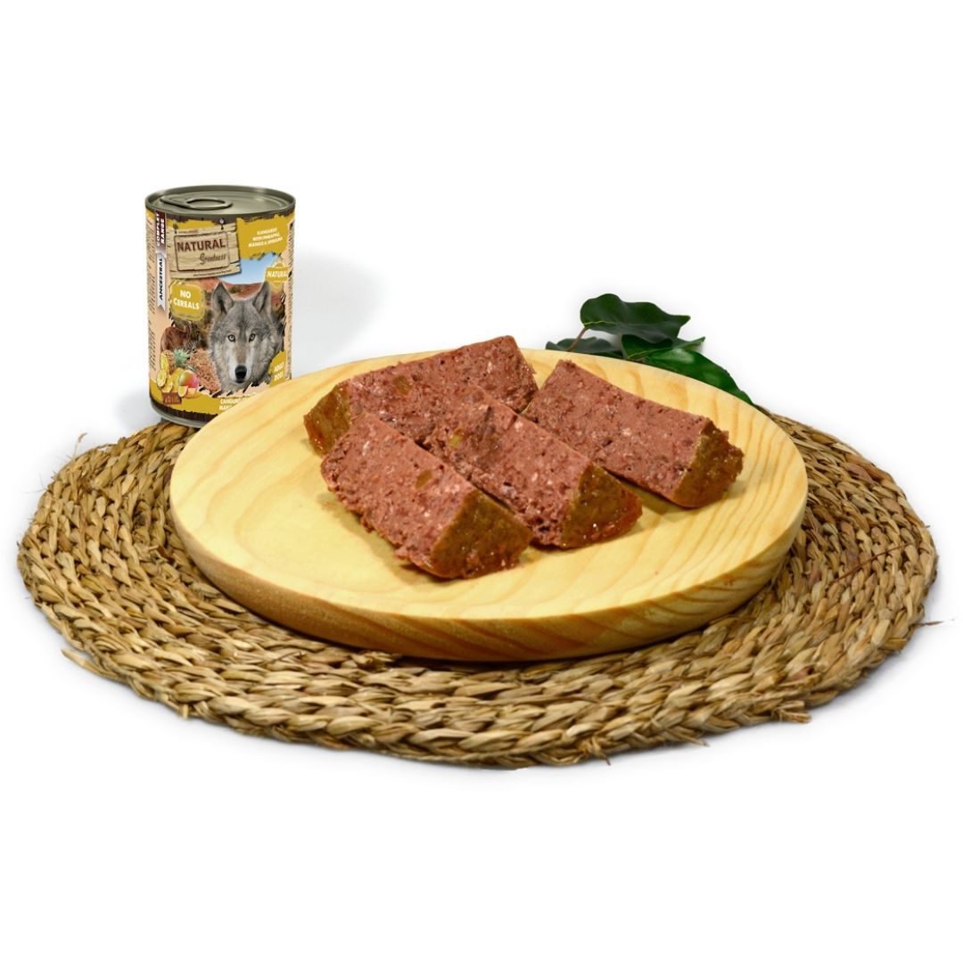 Comida húmeda para perros, receta de Canguro con Piña, Mango y Espirulina, contiene como única fuente de proteína animal, la carne de Canguro.