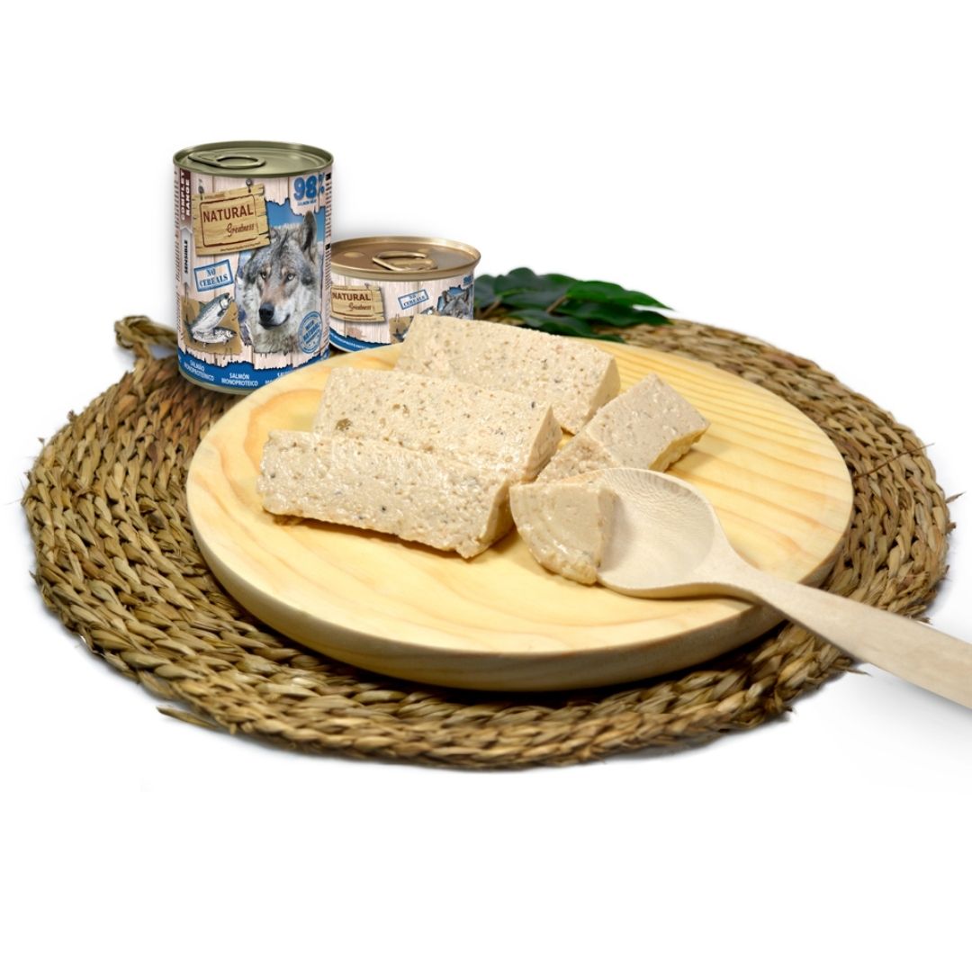 Comida húmeda para perros, receta monoproteica de Salmón, contiene como única fuente de proteína, la carne de Salmón.