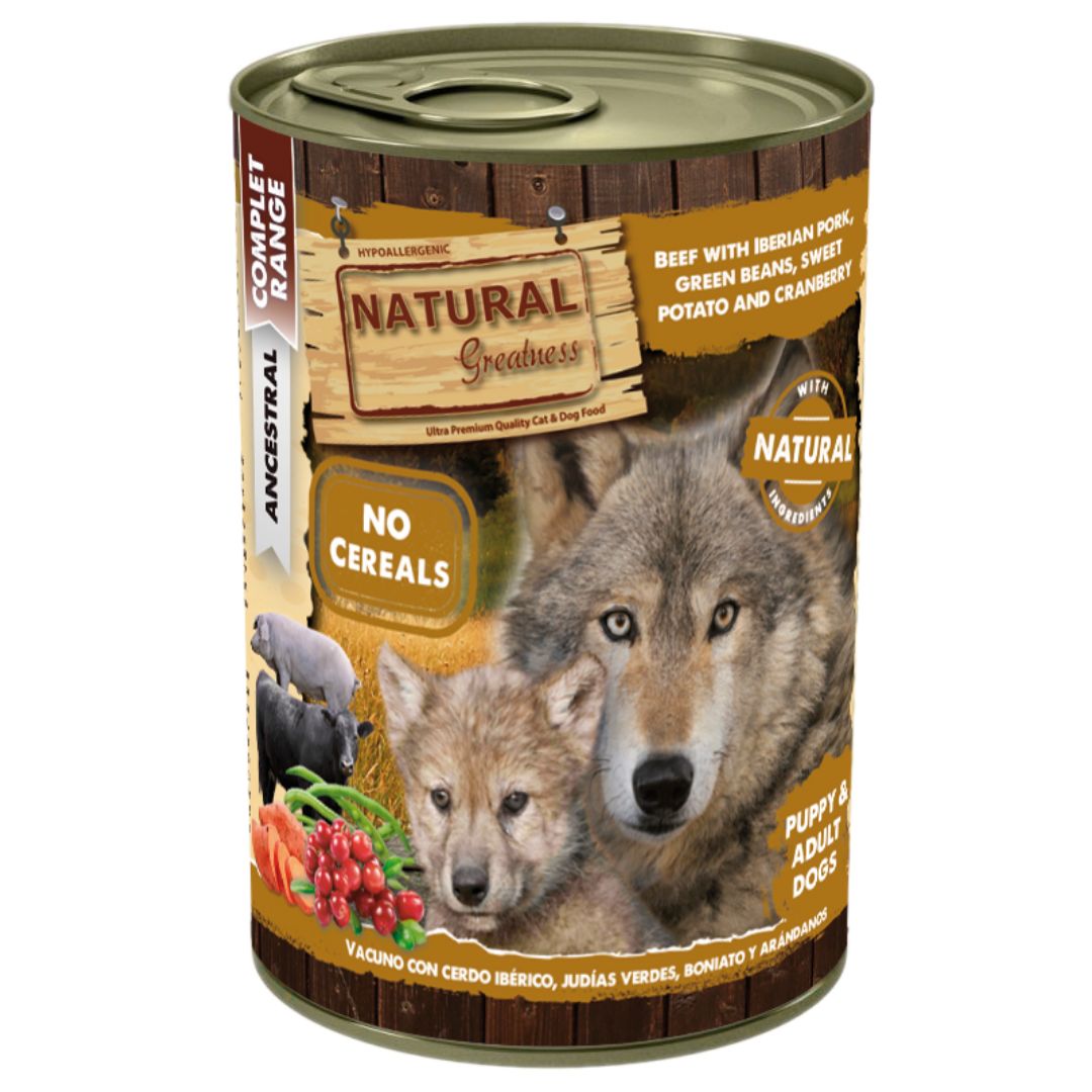 Comida húmeda para perros adultos y cachorros de vacuno con cerdo ibérico, judías verdes, boniato y arándanos.