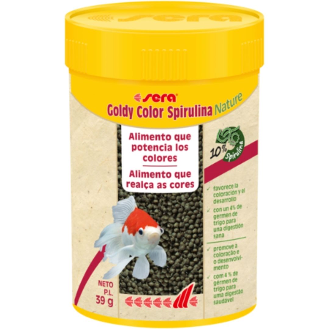 Comida para peces Sera Goldy Color Spirulina Nature es el alimento que potencia los colores en forma de granulado elaborado manteniendo todas sus propiedades, sin colorantes ni conservantes.