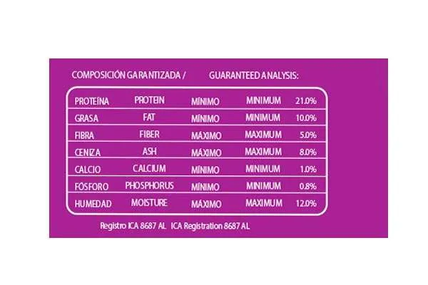 Información Nutricional: Proteína Cruda (mín.): 21%, Grasa Cruda (mín.): 12%, Fibra Cruda (máx.): 3.5%, Humedad (máx.): 12%, Calcio (mín.): 1% Fósforo (mín.): 0.8%