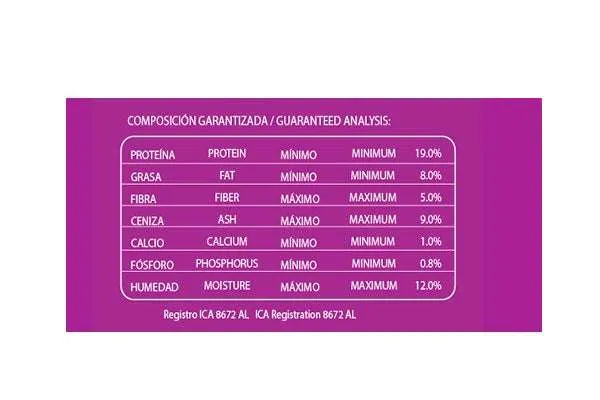 Información Nutricional: Proteína Cruda (mín.): 19%, Grasa Cruda (mín.): 8%, Fibra Cruda (máx.): 5%, Humedad (máx.): 12%, Calcio (mín.): 1% Fósforo (mín.): 0.8%