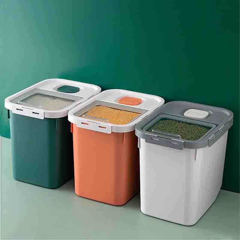 Material de grado alimenticio: hecho de plástico PP de alta calidad, libre de BPA, seguro, no tóxico, inodoro, duradero y fácil de limpiar. Adecuado para almacenar arroz, harina, nueces, frijoles, cereales, comida seca, comida para mascotas y mucho más.