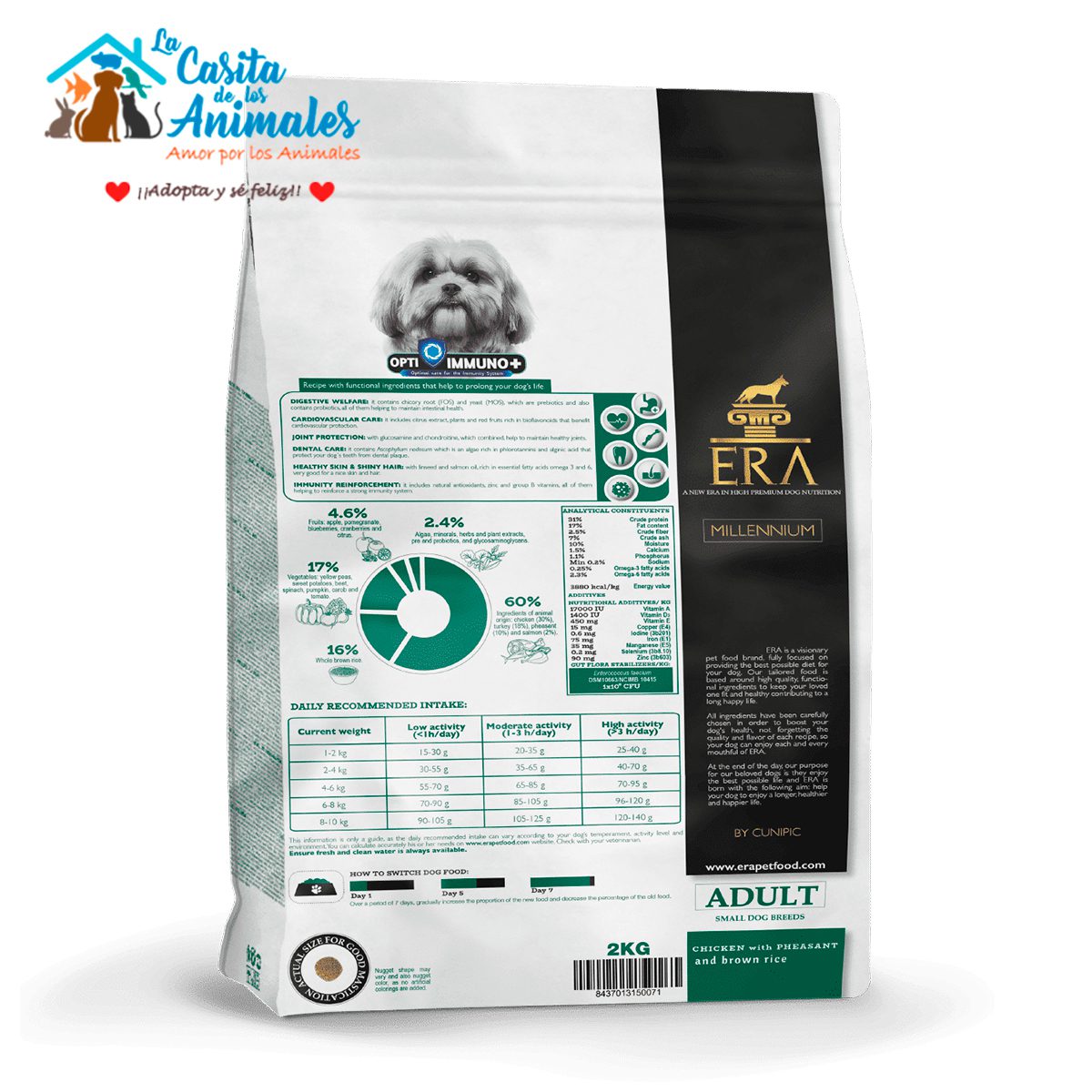 ERA Millennium de pollo y faisán para perros adultos de raza pequeña es un alimento completo y equilibrado para perros adultos de raza pequeña (<10 kg). Su exclusiva fórmula aporta a la receta un alto contenido en proteína y una cuidada mezcla de ingredientes funcionales que ayudarán a tu perro a tener unos huesos fuertes y una óptima y salud.