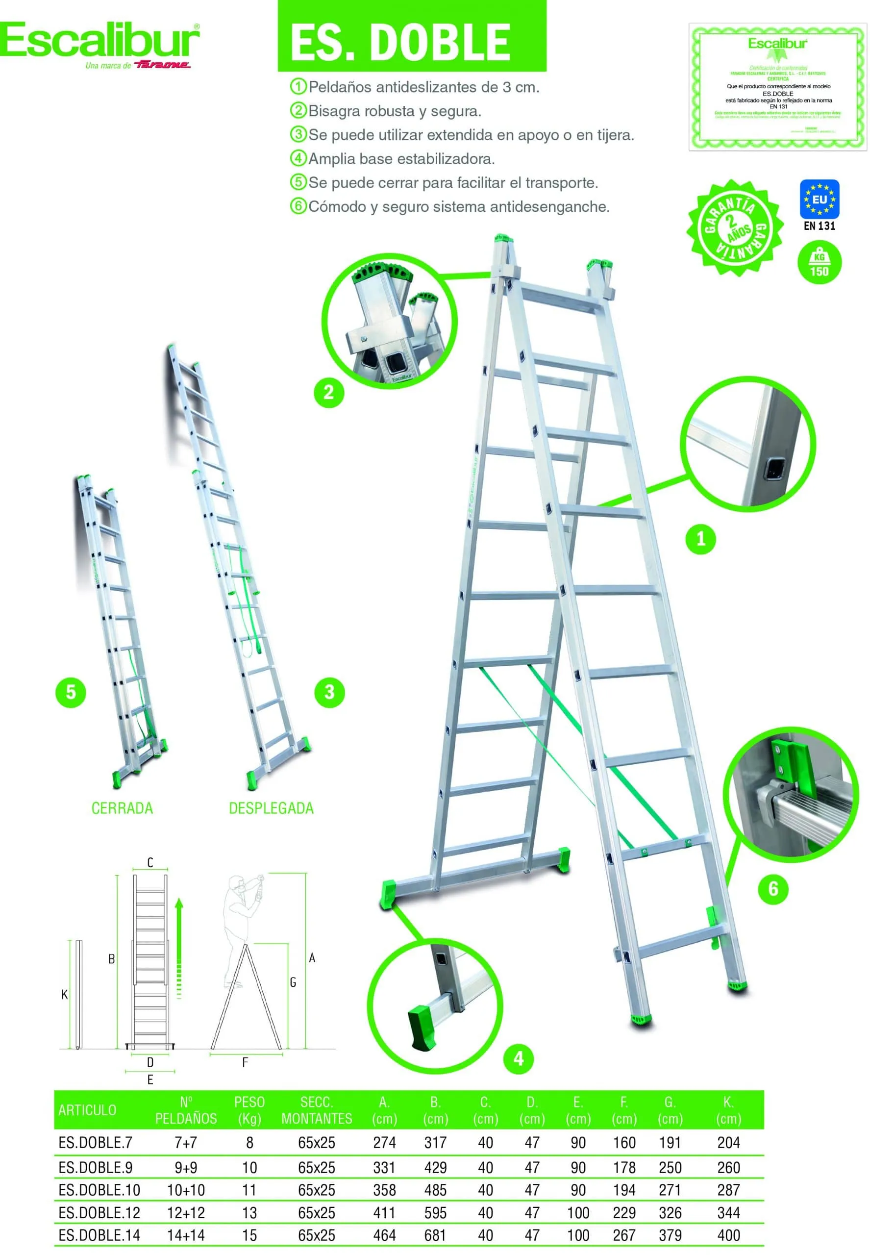 Este producto cumple con la normativa EN 131 y se entrega junto con el certificado de conformidad y el manual de instrucciones. La carga máxima que aguanta es de 150 kg.