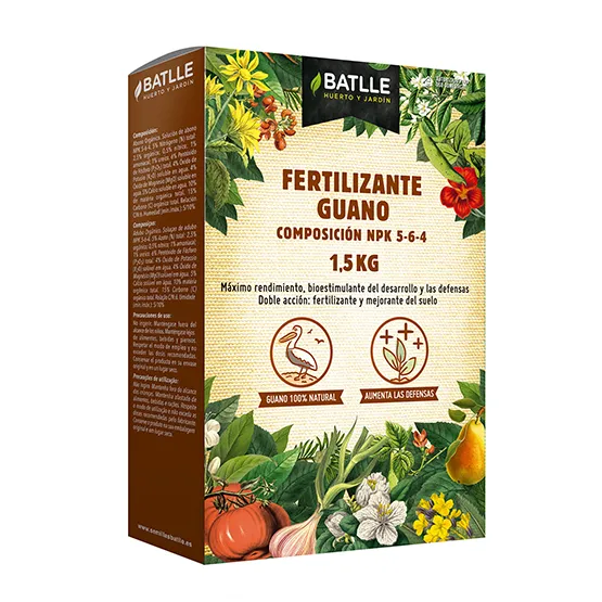 Con su formulación especial, el Fertilizante Guano Ecológico BATLLE está diseñado para promover un crecimiento equilibrado, un desarrollo vigoroso y una floración exuberante en tus plantas. Además, estimula las defensas naturales de las plantas, fortaleciéndolas y protegiéndolas de enfermedades y plagas.