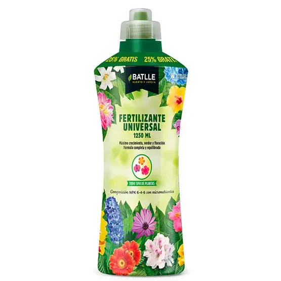 El Fertilizante Universal BATLLE líquido es un complejo nutritivo de alta asimilación y rápida respuesta, formulado para aportar los nutrientes necesarios que permiten un correcto desarrollo, crecimiento y floración de cualquier tipo de planta en todas las condiciones, interior, terraza y jardín.