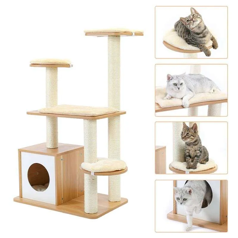 Fabricado con materiales de alta calidad y cubierto con una suave felpa, ofrece un espacio cómodo para que tu gato descanse, juegue y afile sus garras. El diseño ergonómico y la estructura resistente garantizan durabilidad y estabilidad. Con diferentes niveles y plataformas, tu gato puede explorar, trepar y observar su entorno desde diferentes alturas. Las áreas de descanso acolchadas proporcionan confort. Este rascador no solo satisface las necesidades naturales de tu mascota, sino que también se integra armoniosamente en tu hogar con su atractivo color y diseño. Ofrece a tu gato un refugio propio y fomenta un ambiente enriquecedor y divertido.