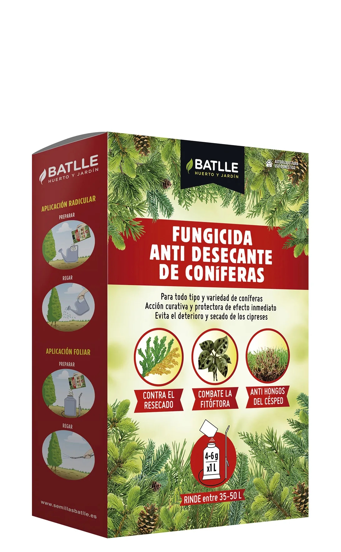 El Fungicida Anti Desecante de Coníferas BATLLE es un complejo nutritivo con actividad fúngica, de total asimilación formulada en base a abono NPK 5-32-20, excento de cloruros, que combate y previene el amarronamiento y secado de las coníferas. Incorpora hierro para potenciar en un corto espacio de tiempo el verdor de la planta y magnesio para desbloquear la estructura nutritiva del suelo. Su alta movilidad por la planta permite tanto un uso radicular como foliar. Fungicida Antidesecante Coniferas 200g