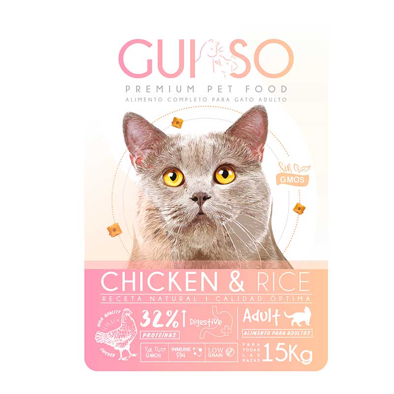 Guiso Cats Chicken & Rice es un alimento natural para gatos adultos de todos los tamaños de razas, elaborado a base de pollo y pescado. Este pienso completo satisface todas las necesidades de un gato adulto con un nivel de actividad normal.