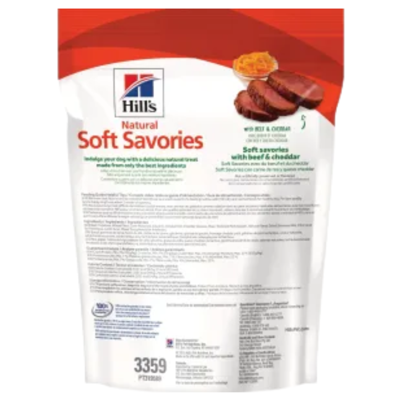 Los premios para perros Hill’s® Natural Soft Savories with Beef & Cheddarson deliciosos, naturales y hechos de solamente los mejores ingredientes. La textura suave y tierna junto con una variedad de sabores divertidos harán feliz a su perro. Sin conservadores o saborizantes artificiales.