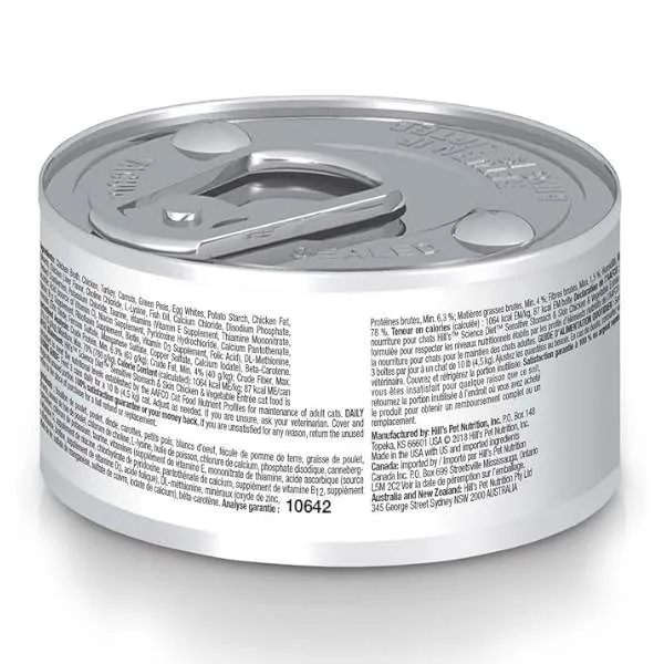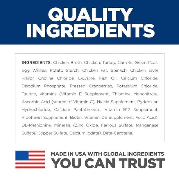 INGREDIENTES: Caldo de pollo, pollo, pavo, zanahorias, guisantes verdes, claras de huevo, almidón de patata, grasa de pollo, espinacas, sabor a hígado de pollo, cloruro de colina, L-lisina, aceite de pescado, cloruro de calcio, fosfato disódico, arándanos, cloruro de potasio, taurina, vitaminas (suplemento de vitamina E, mononitrato de tiamina, ácido ascórbico (fuente de vitamina C), suplemento de niacina , Piridoxos Clorhidrato de ina, Pantotenato de Calcio, Suplemento de Vitamina B12, Suplemento de Riboflavina, Biotina, Suplemento de Vitamina D3, Ácido Fólico), DL-Metionina, minerales (óxido de zinc, sulfato ferroso, sulfato de manganeso, sulfato de cobre, yodato de calcio), betacaroteno.