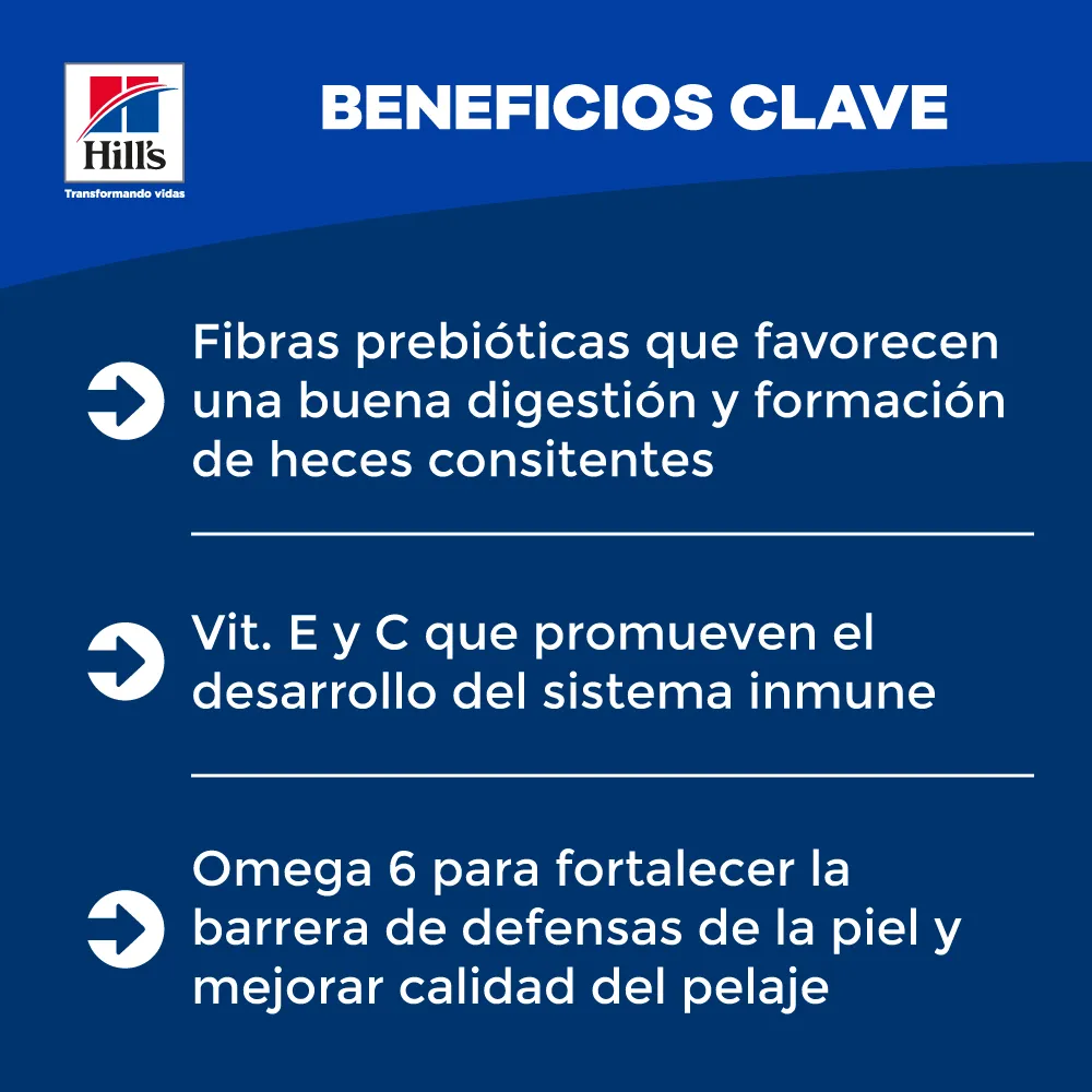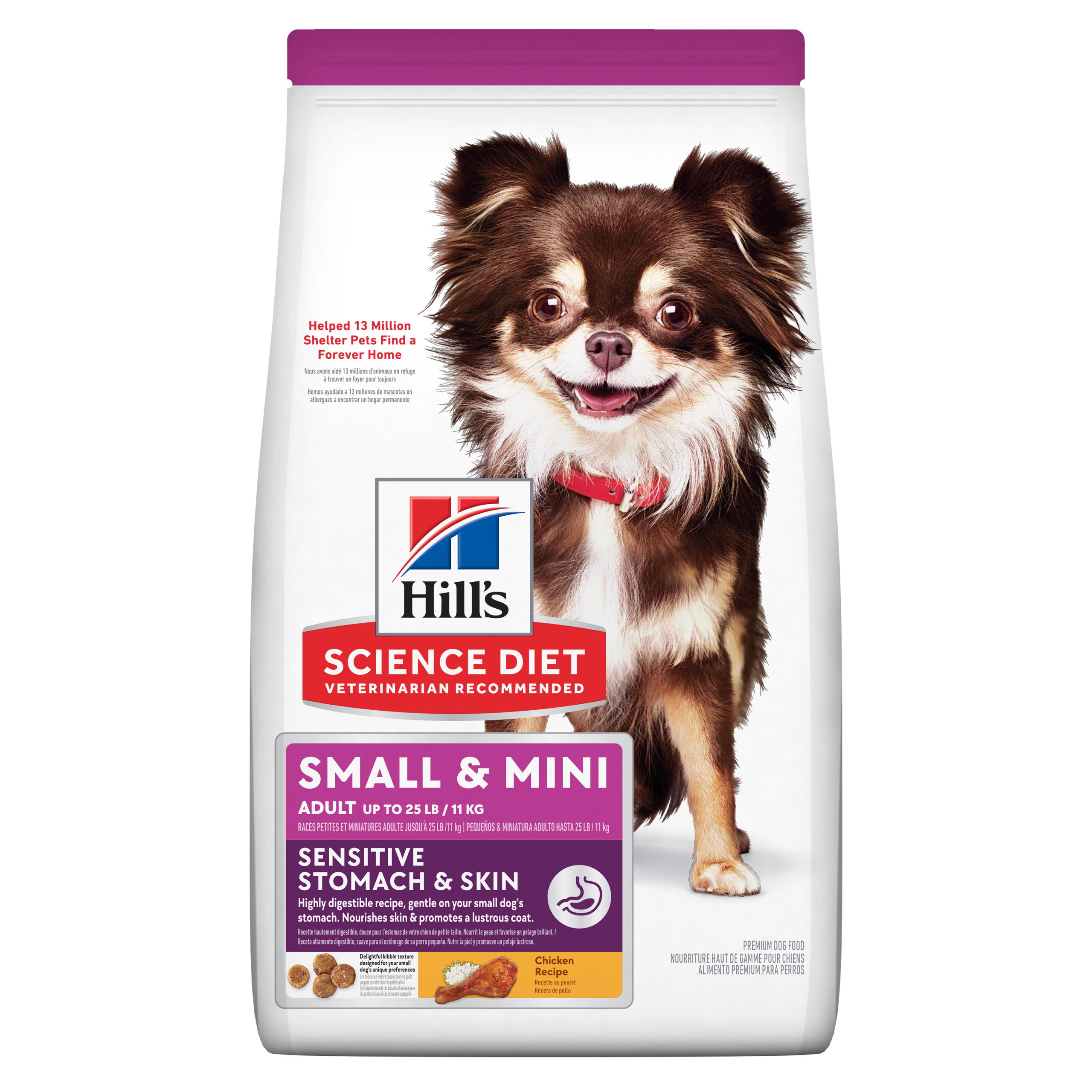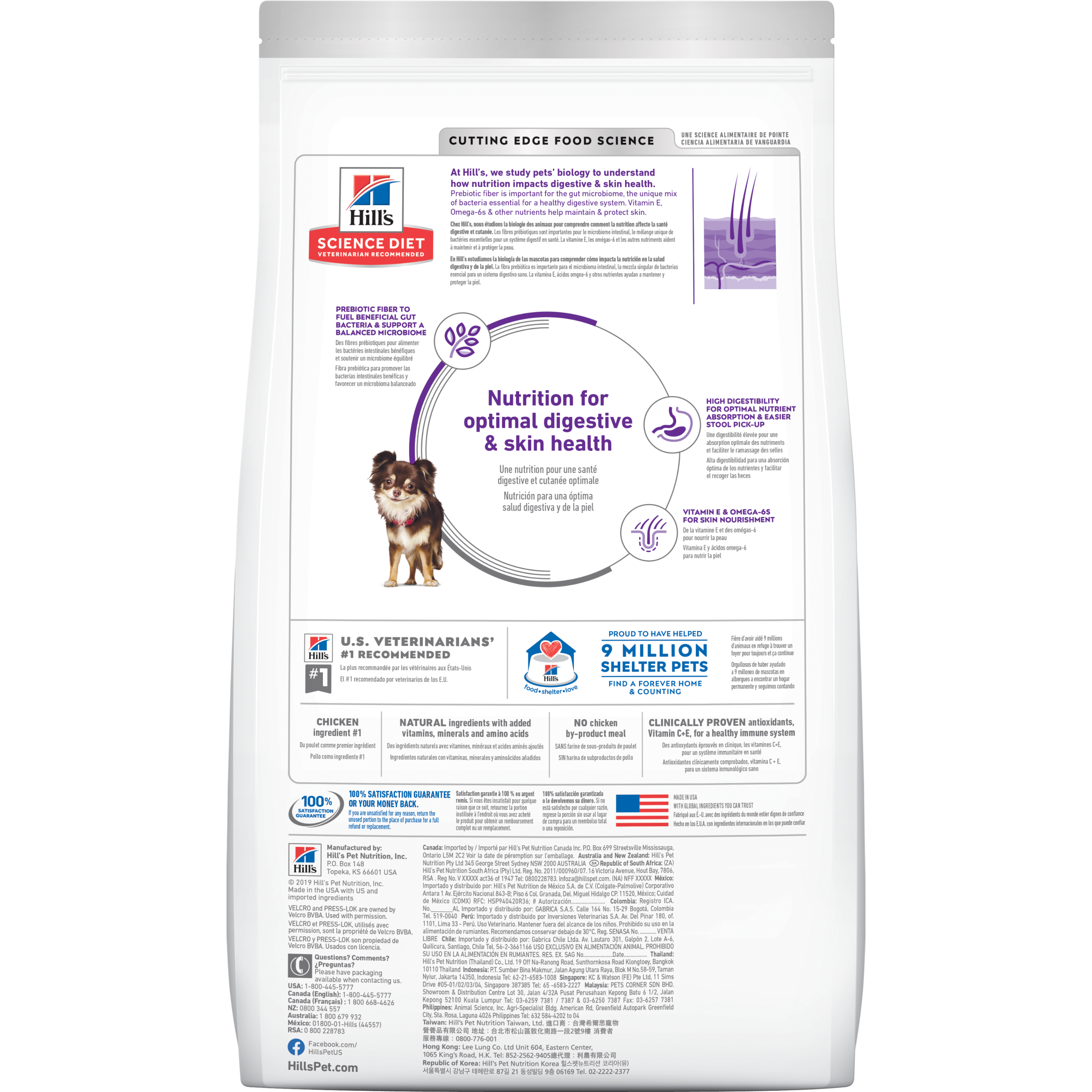 El alimento seco para perros Hill’s Science Diet Small & Mini Sensitive Stomach & Skin es suave para el estómago mientras nutre la piel y promueve un pelaje lustroso.