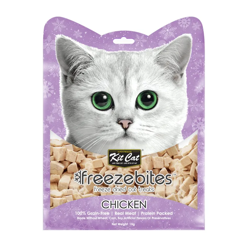 Los Kit Cat FreezeBites Pollo Snacks naturales para gatos son unos deliciosos premios naturales para gatos. Están liofilizados para mantener todas sus propiedades y su sabor a pesar de estar deshidratados. Aunque el nombre es un poco raro, se trata de una técnica ancestral para la conservación de los alimentos. Kit Cat vaporiza suavemente y luego liofiliza los ingredientes del snack para conservar los nutrientes y concentrar los sabores naturales. Sin cereales, sin gluten y sin aditivos artificiales.