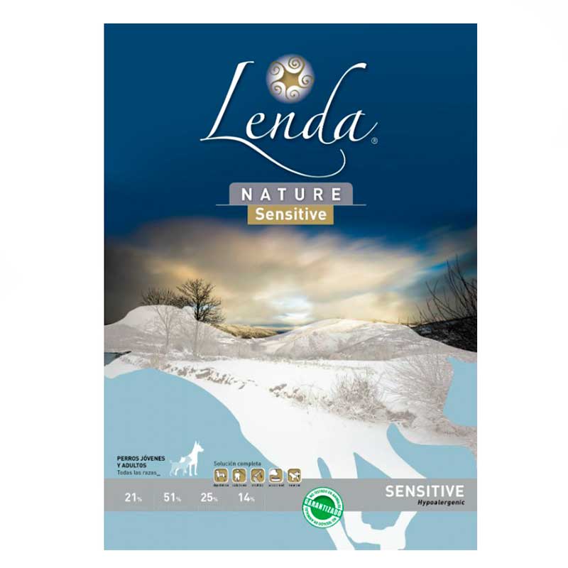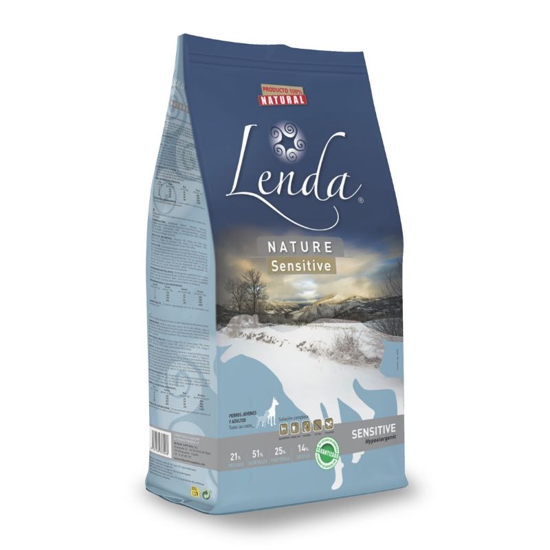 Lenda Sensitive Pescado Blanco y Patata es un pienso natural sin cereales, hipoalergénico, completo y extrusionado para perros adultos con pieles o digestiones muy sensibles. Este alimento pertenece a la gama Lenda Nature Grain-free (sin cereales) y está pensado para cualquier tamaño de raza. está elaborado a base de merluza y patata.