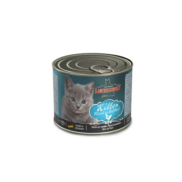Leonardo Lata Kitten es la mejor forma de empezar a vivir. Este delicioso alimento completo húmedo Super Premium con carne tierna de ave y una dosis saludable de aceite de salmón encantará hasta los gatitos más quisquillosos. Puedes usarlo como complemento o como alimento completo.