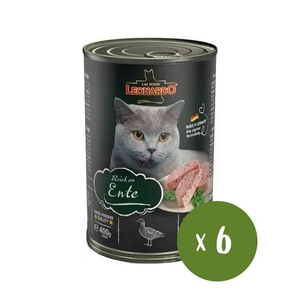 Leonardo Lata Pato es un alimento húmedo completo Super Premium para gatos rico en pato. En su fórmula solamente se utilizan productos cárnicos frescos. Gracias a la alta disponibilidad biológica y a la alta calidad de estos productos, su gato necesita una cantidad relativamente pequeña para satisfacer sus necesidades nutricionales diarias. Puedes usarlo como complemento o como alimento completo.