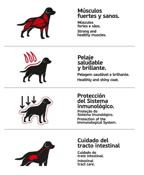 Ingredientes: Harina de pollo, arroz molido, maíz,, harina de pescado, gluten de maíz, trigo molido, harina de pescado, gluten de maiz, grasa animal preservada con etoxiquin y BHT, levadura de cerveza, pulpa de remolacha, extracto de yuca, concentrado de mananos y beta gluconas (secuestrante de toxinas e inmuno estimulantes), saborizantes naturales, Metionina, Suplemento vitamínico con adición de vit: A,E,D,B1,B2,B6,B12, Niacina, Ácido pantoténico, Biotina, ácido fólico, fosfato dicálcico, sulfato de hierro, óxido de manganeso, óxido de zinc, sulfato de cobre, yodato de potasio, sulfato de cobalto, selenito de sodio, aporte de minerales quelados: Zinc, Selenio, Cobre y Manganeso. No contiene colorantes.