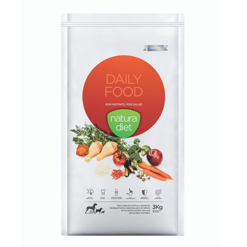Natura Diet Daily Food es un pienso natural, completo, nutritivo y equilibrado para que nuestra mascota disfrute de una dieta diaria de la mas alta calidad y muy saludable. Este alimento esta pensado para cualquier raza o tamaño de perros adultos.