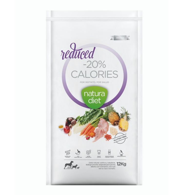 Natura Diet Reduced -20% Calorias es una comida natural completa y biológicamente adaptada para bajar el peso de aquellos perros adultos con sobrepeso u obesidad de cualquier tamaño de raza.
