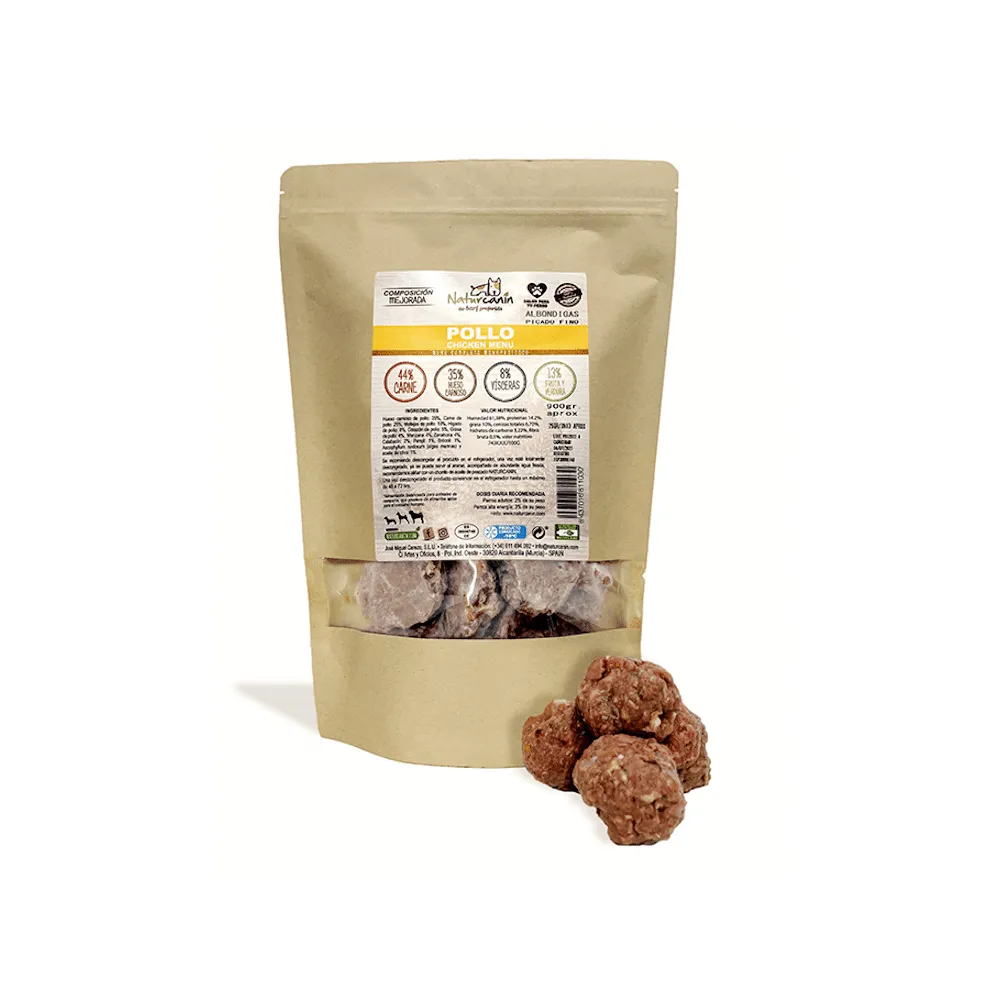 Hueso carnoso pollo 35,0% carne pollo 25,0% mollejas pollo 10,0% hígado pollo 8,0% corazón pollo 5,0% grasa pollo 4,0% manzana 4,0% zanahoria 4,0% calabacín 2,0% perejil 1,0% brócoli 1,0% Ascophyllum nodosum (algas marina) y aceite de oliva 1,0%