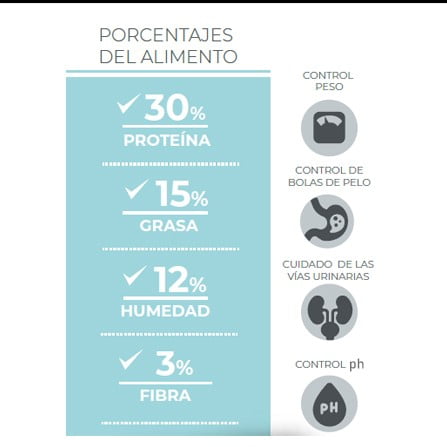 Harina de pollo, arroz, gluten de maíz, albúmina en polvo, trigo, grasa animal (pollo), aceite de pescado (fuente de omega 3), hidrolizado proteico de menudencias porcinas, pulpa de remolacha (fuente de fructo-oligosacáridos – FOS), levadura de cerveza, fuente de fibra insoluble (celulosa), sal, acidificante en polvo (bisulfato ácido de sodio), extracto de yucca schidigera, manano-oligosacáridos MOS, nucleótidos de levadura, carbonato de calcio, dipropionato de amonio, ácido propiónico, pirofosfato ácido de sodio, glucosamina, condroitin sulfato, colágeno hidrolizado, L-carnitina, metionina, antioxidantes naturales: extracto de romero, ácido cítrico, vitamina C, betacaroteno, luteína, polifenoles, taurina, vitaminas: A, D3, E, K, B1, B2, B6, B12, ácido fólico, ácido nicotínico, pantotenato de calcio, biotina, colina, minerales: zinc, hierro, cobre, manganeso, yodo, selenio.