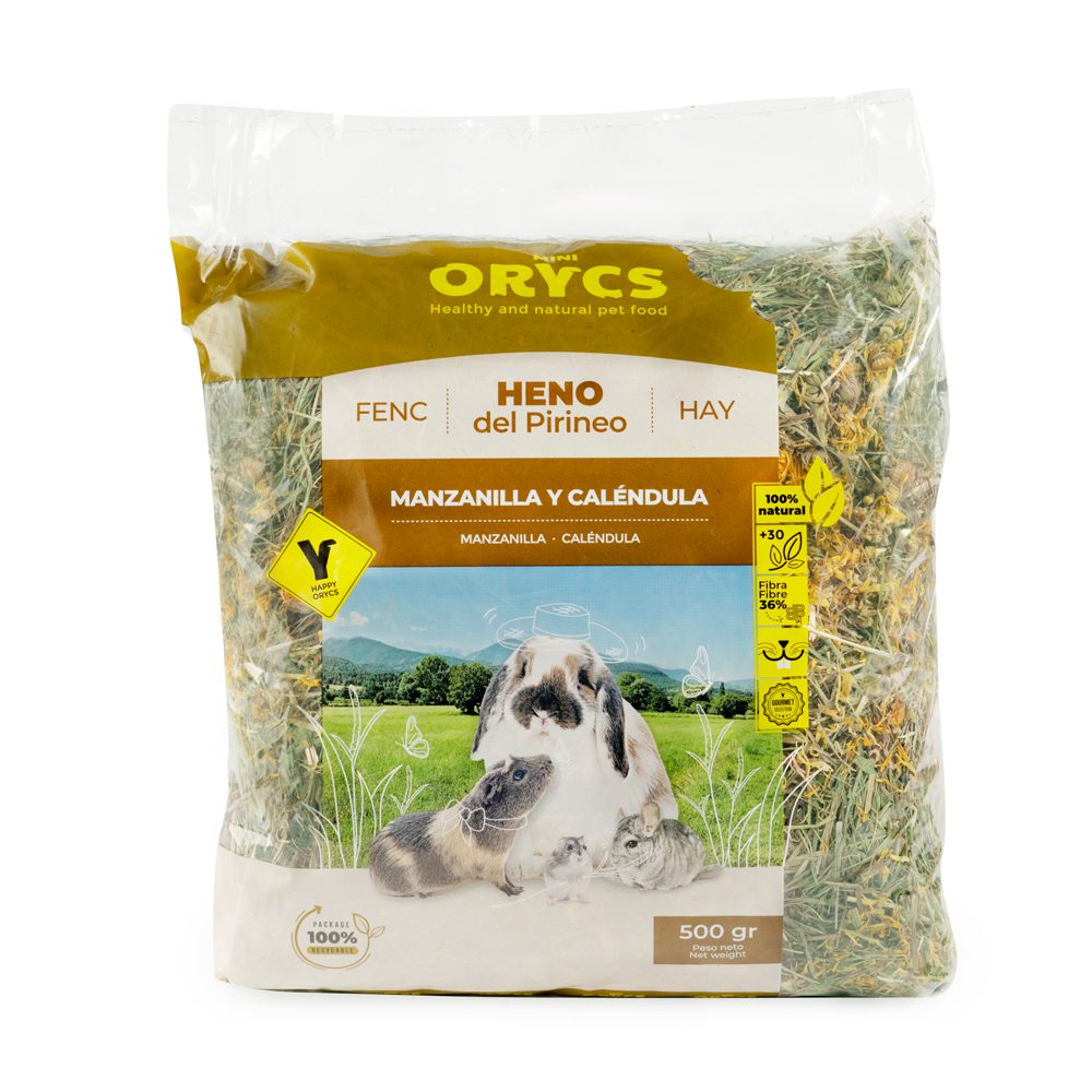 Heno del Pirineo con flores de manzanilla que tiene propiedades desinfectantes, tonificantes, antiinflamatorias y antiespasmódica. Y caléndula que ayuda a combatir problemas digestivos y eliminar los parásitos intestinales.