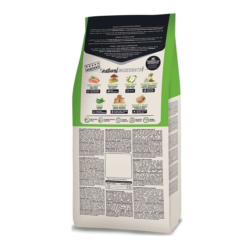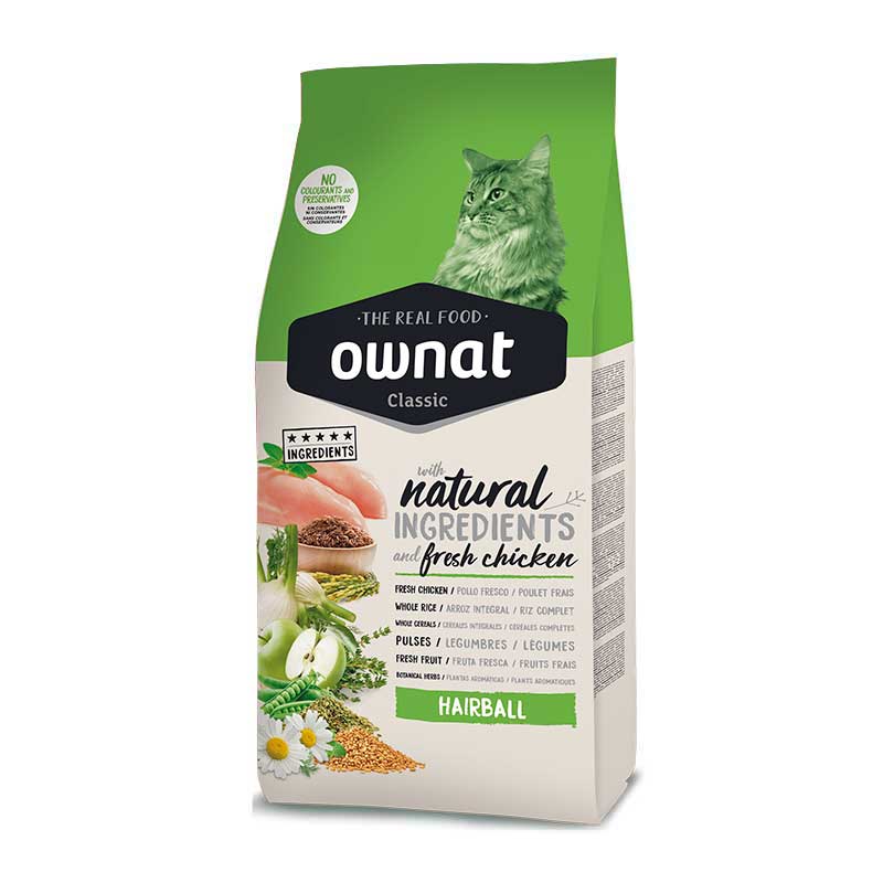Ownat Classic Hairball es una comida natural para gatos adultos. Está hecha a base de pollo fresco y contiene los nutrientes necesarios para satisfacer las necesidades nutricionales de los felinos adultos con un nivel de actividad normal. Los gatos son unos animales muy limpios y están constantemente acicalándose por lo que pueden ingerir grandes cantidades de pelo. Ownat Classic Hairball contiene extracto de malta y fibras para prevenir una excesiva caída del pelo y favorecer la evacuación de los pelos ingeridos por los felinos evitando así la formación de bolas de pelo.