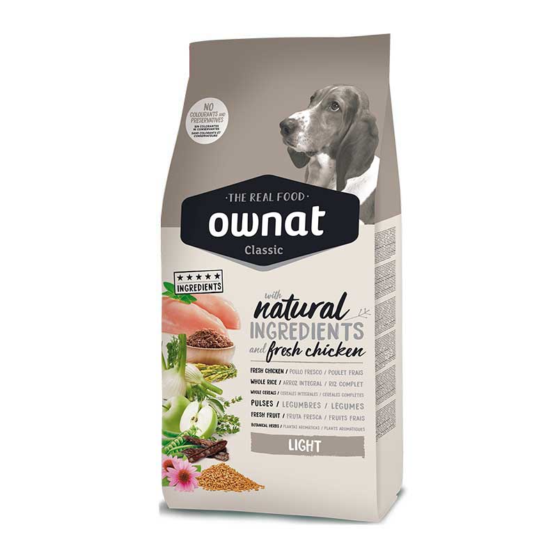 Ownat Classic Light es una comida natural para perros adultos con problemas de peso y tendencia a engordar. Está elaborada a base de pollo fresco y es bajo en grasas y calorías pero a su vez contiene los nutrientes necesarios para garantizar la salud de su mascota y un alto valor proteico para asegurar el buen mantenimiento de la masa muscular.