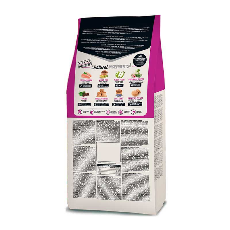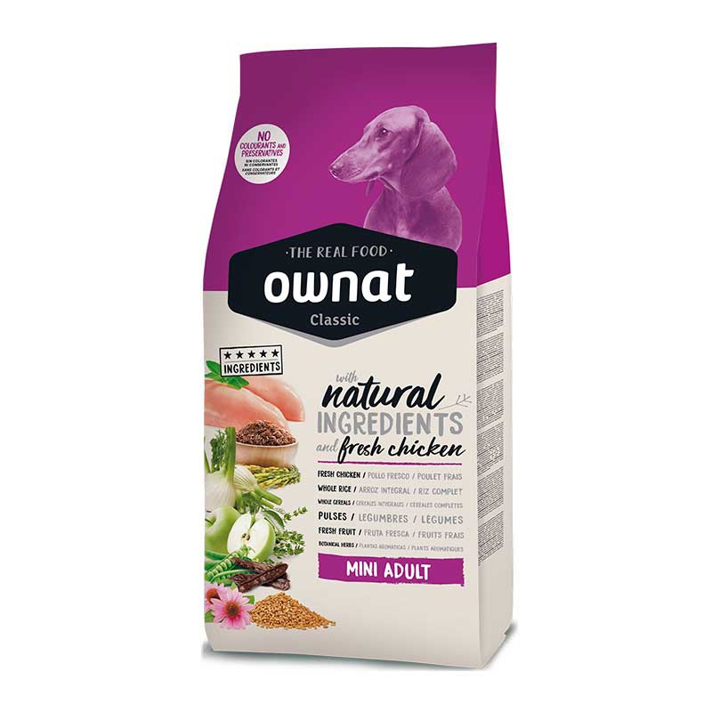 Ownat Classic Mini Adult es un pienso natural para perros adultos de raza pequeña (entre 1 y 10Kg), completo y equilibrado elaborado a base de pollo fresco. Contiene un alto valor proteico y calórico para satisfacer las necesidades de las razas pequeñas y el tamaño de la croqueta se adapta perfectamente al de sus pequeñas mandíbulas. Este alimento cubre todas las necesidades nutricionales de perros adultos con un nivel de actividad normal.
