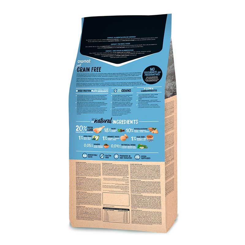 Ownat Just Grain Free Adult Lamb es un pienso natural sin cereales para perros adultos muy completo y equilibrado elaborado a base de cordero fresco. Contiene un 20% de carne fresca y una gran cantidad de ingredientes de origen animal, logrando así un gran sabor y un aprovechamiento más eficiente de los nutrientes. Ownat Just Grain Free Adult Lamb es ideal para aquellos perros con problemas digestivos o con problemas en la piel y el pelo. Este alimento cubre todas las necesidades nutricionales de perros adultos con un nivel de actividad normal y de todos los tamaños de razas.