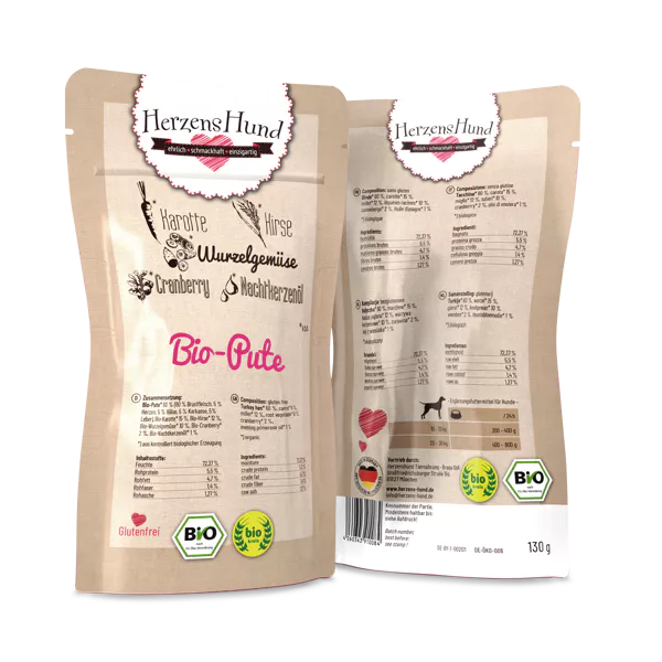 Sobres de comida húmeda con certificación BIO para perros de la marca alemana HerzensHund se presentan en diversas variedades. Una de ellas es la de Pavo con verduras BIO.