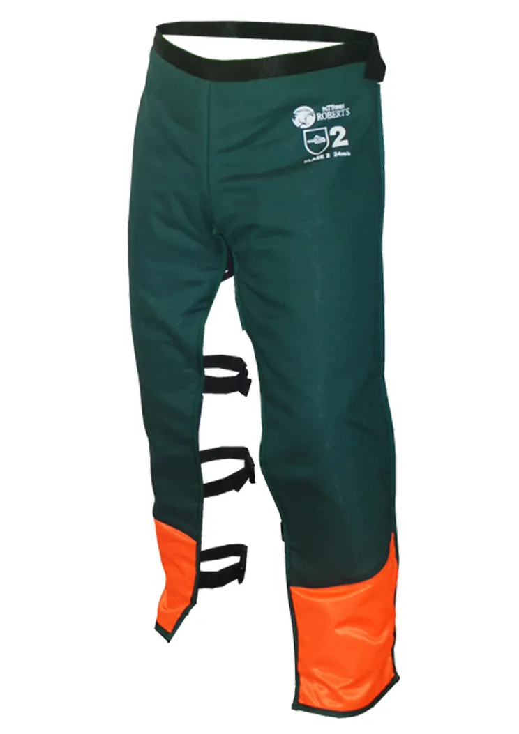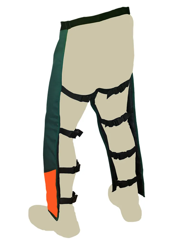 Cómodo zahón anti-corte clase 2 (homologado para motosierra) con sujeción. Presenta un tejido exterior anti-agua y anti-manchas, ajustándose a la cintura y piernas mediante goma y broches.