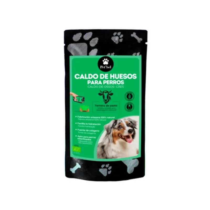 Es un caldo monoprotéico. Ideal para peludos con alergias e intolerancias a otras carnes. Fuente natural de colágeno, proteínas y minerales como calcio, potasio y magnesio.