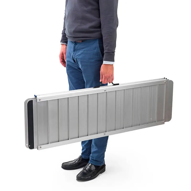 Las Rampas Sky Libro, fabricadas en aluminio de alta calidad, se destacan por su ligereza y durabilidad. Ideales para personas en silla de ruedas o con scooter, estas rampas permiten superar escalones de forma segura y sencilla. Gracias a sus bisagras resistentes y superficie con dibujo antideslizante, proporcionan una mayor seguridad en su uso. Su diseño plegable facilita el almacenamiento y transporte, complementado con asas integradas y una bolsa de transporte incluida.