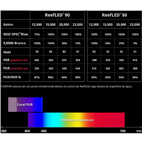 En el corazón de la unidad, hay un solo panel LED compacto que incluye un canal “REEF-SPEC Blue” de 23,000 Kelvin de longitud de onda múltiple (una mezcla de LED azul, violeta y ultravioleta) que, junto con un canal blanco de 8.000 K, proporciona un rango de temperatura de color seguro para los arrecifes que permite que todos los corales crezcan.