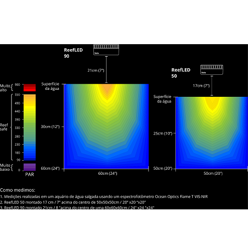 ReefLED es seguro para los arrecifes, ya que proporciona valores de PAR ideales en todo el acuario, sin puntos calientes o áreas con luz insuficiente para el crecimiento de los corales. El mapa de distribución de PAR muestra los niveles reales de PAR, ya que varían en la sección transversal del acuario.